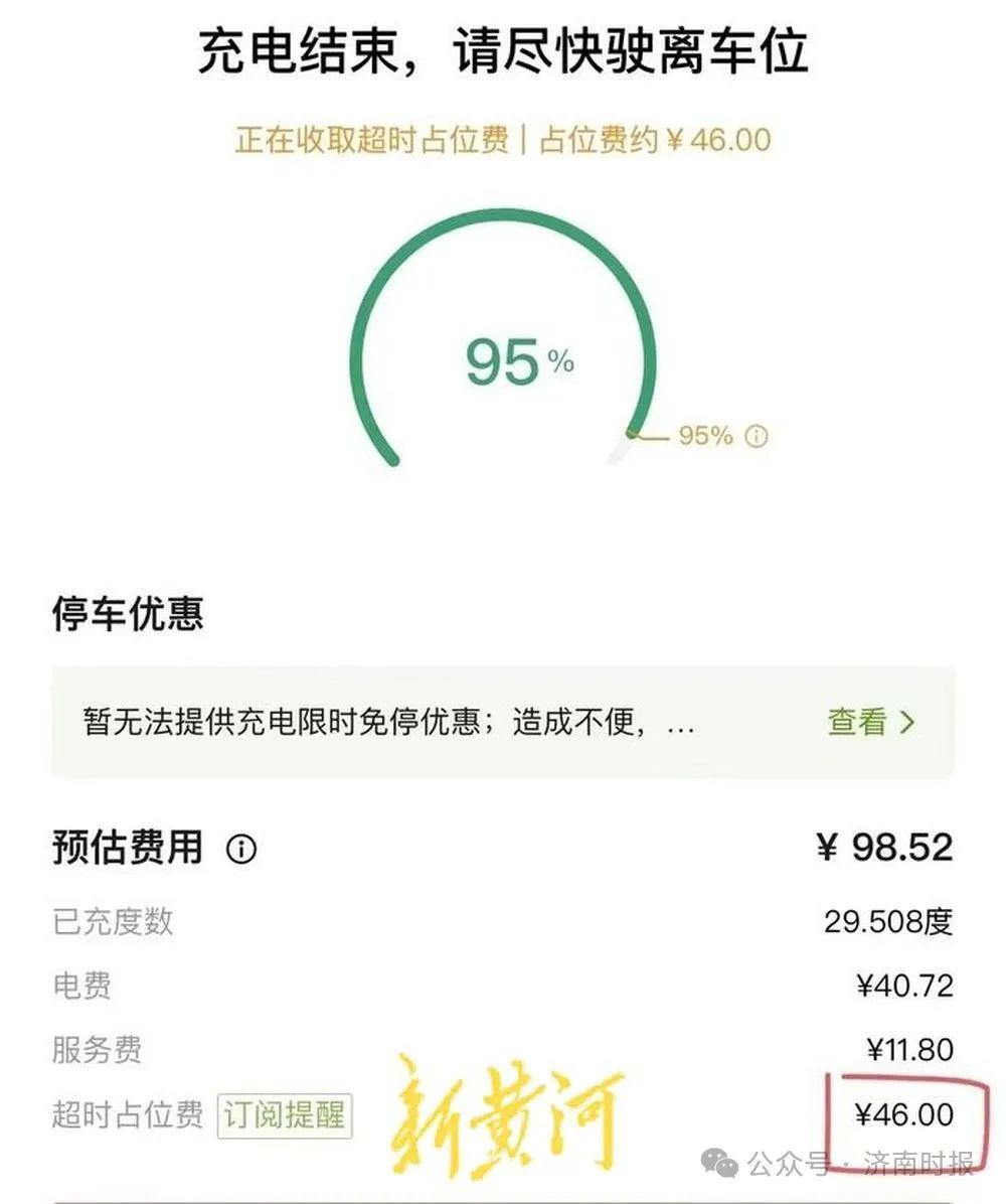 随着新能源汽车数量的增加,公共充电桩成了紧缺资源,充电时长和轮转效率都成为大家关注的焦点,“超时占位费”也应运而生。近日,市民张艳_(化名)_向新黄河记者反映,8月26日自己去济南融创乐园游玩,在融创文旅城停车场二层H区的小鹏充电桩充电,充完电后小鹏停车场按照一元一分钟收取占位费,自己最终缴纳充电费40.72元、服务费11.8元、占位费46元、停车费8元,在张艳看来,缴纳了停车费后就不应再缴纳占位费。